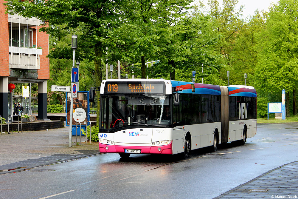 (n.de) Nach der Inbetriebnahme des ersten batterieelektrischen Gelenkbusses durch die NEW mobil und aktiv Mönchengladbach GmbH wurde im März der Solaris Urbino 18 mit der Wagennummer 1261 ausgemustert. Das Einzelstück war im Dezember 2012 aufgrund des Bedarfs an einem zusätzlichen Gelenkbus in Dienst gestellt worden und der einzige von Solaris nach Mönchengladbach gelieferte Gelenkbus der dritten Bauform des Urbino, von der in den Jahren 2010 bis 2012 sonst 38 Solowagen in den Bestand gelangten. Die Aufnahme zeigt das Fahrzeug am 19.04.2024 kurz nach Verlassen des Viersener Busbahnhofes. Mit dieser Ausmusterung schied zudem der letzte Dieselbus aus dem Bestand der NEW aus, dessen Motor noch nicht die Euro VI-Abgasnorm erfüllte.