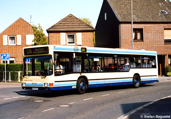 Die Linie 038 zwischen Willich-Anrath und Willich-Neersen erfährt im Wochenend-Angebot eine deutliche Aufwertung. Am 10.09.2004 wurde der MAN A10 (NL 222) mit der Wagennummer 9619 in Anrath auf der Schnittelstraße aufgenommen. |