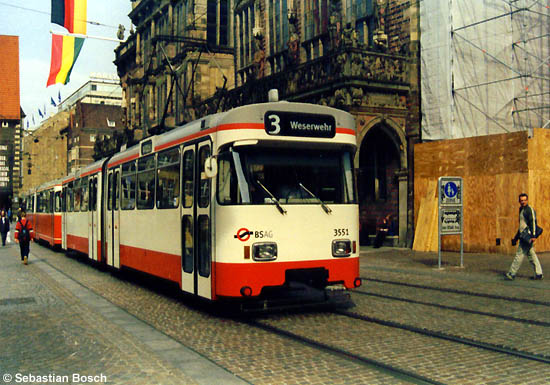 | In Bremen verkehren die Straßenbahnen und auf Teilabschnitten auch Busse durch die Fußgängerzone in der Innenstadt mit teilweise dichter historischer Bebauung. In einem von Bussen und Bahnen gemeinsam genutzten Bereich - wie das Schild rechts im Bild beweist - konnte der Straßenbahnwagen 3551 am 12.09.2003 am Bremer Dom aufgenommen werden. |