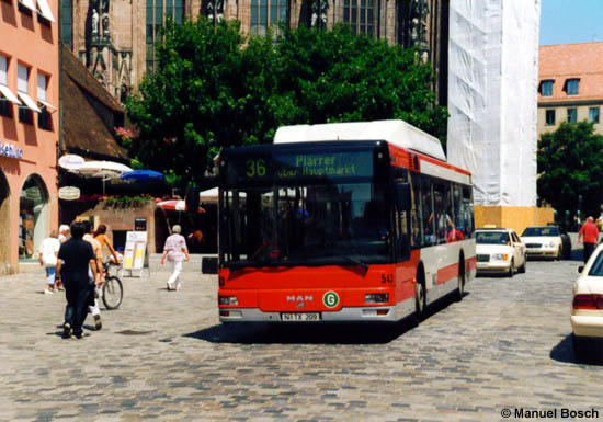 | Teilstücke der Nürnberger Fußgängerzone werden nicht nur von der Buslinie 36 befahren, sondern ebenso von Taxen. Das Bild zeigt den Wagen 543 der Verkehrs-Aktiengesellschaft Nürnberg, einen MAN A21 (NL 233 CNG), am 17.06.2003 am Hauptmarkt. |