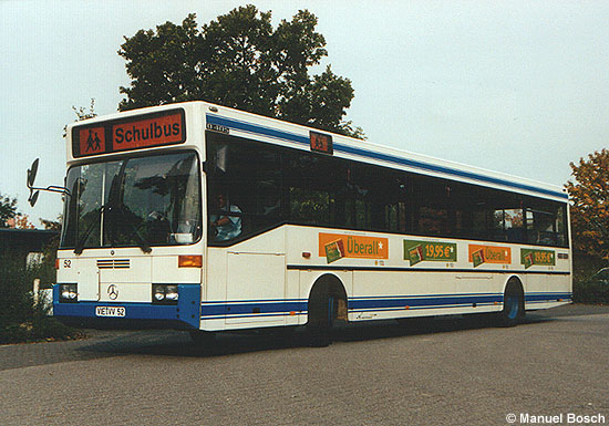Die niederrheinwerke in Viersen nahmen in diesem Jahr ihre letzten beiden Mercedes-Benz O 405 außer Betrieb. Mit dem Wagen 52 wurde zugleich auch der letzte Omnibus in der Lackierung mit den Viersener Stadtfarben abgestellt, die von 1986 bis 1989 verwendet wurde. Am 02.10.2002 stand der Wagen am SportCentrum Ransberg als Schulbus bereit. |