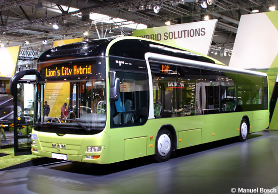 MAN A37 Hybrid (Lion's City), Vorführwagen auf der IAA Nutzfahrzeuge 2010, Solobus mit seriellem Hybridantrieb und entsprechenden Dachaufbauten.