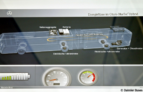 EvoBus MB O 530 GDH (Citaro), Anordnung der Antriebsausrüstung im Fahrzeug, dargestellt auf dem Energiefluss-Bildschirm im Fahrgastraum.