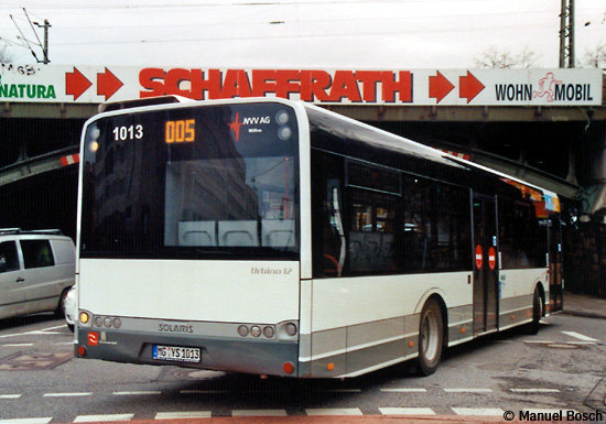Solaris Urbino 12, Wagen 1013 der NVV aus Mönchengladbach, Heckansicht der Türseite mit dem Motorturm links.