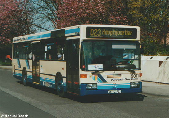 Nach einem Exemplar im Februar 1990 stellte die SWMG im Februar 1991 zwei weitere Mercedes-Benz O 405 N1 in Dienst. Der Wagen 9011 wurde am 16.04.2003 auf der Hardter Waldstraße in Mönchengladbach-Hardt aufgenommen. |