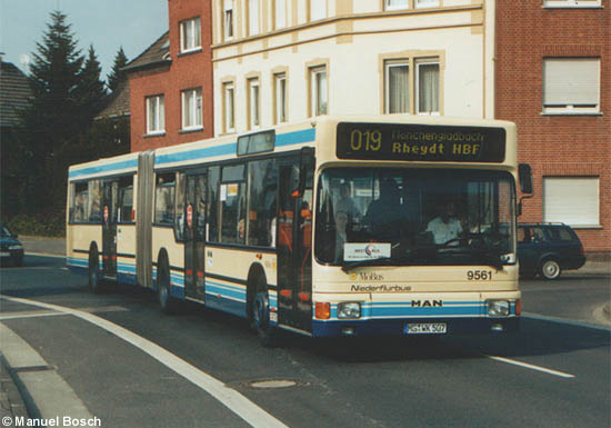 | Mit Euro 2-Motoren ausgestattet sind die sieben im Jahre 1995 in Dienst gestellten MAN A11 (NG 312) der NVV. Der Wagen 9561 - inzwischen der älteste Niederflur-Gelenkbus in Mönchengladbach - befährt am 28.03.2003 die Gladbacher Straße in Viersen. |