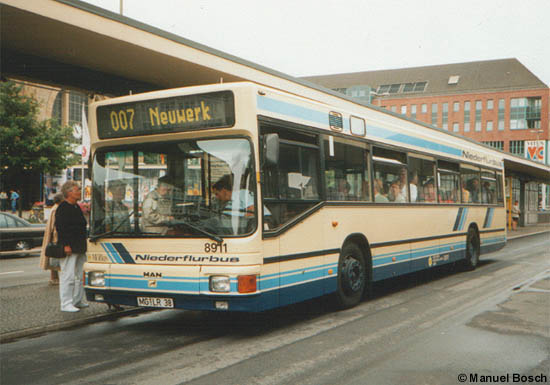 | Ende Januar 1990 gelangte als erster Niederflurbus der Standardgeneration ein MAN NL 202 mit der Wagennummer 8911 in den Bestand der SWMG. Im Sommer 1995 wurde der Wagen am alten Busbahnhof vor dem Hauptbahnhof von Mönchengladbach aufgenommen. |