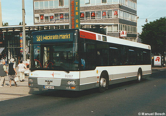Aufnahme: Erst wenige Wochen im Einsatz stand der MAN A21 (NL 223) mit der Nummer 0207, der am 02.09.2002 als Linie SB1 an der Musical-Bühne in der Innenstadt von Mönchengladbach aufgenommen werden konnte.