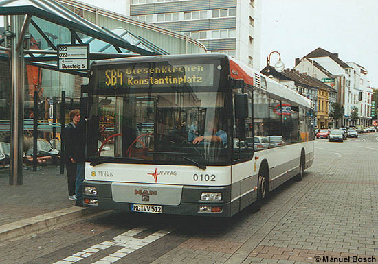 Aufnahme: Am Marienplatz in Mönchengladbach-Rheydt steht der Wagen 0102, ein MAN A21 (NL 223), am 28.09.2002 zur Fahrt nach Giesenkirchen bereit.