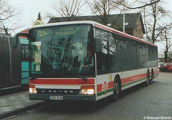 Aufnahme: Die StädteSchnellBus-Lackierung des auf das Kennzeichen D-BV 6002 zugelassenen Setra S 315 NF der BVR ist durch die Werbung teilweise verdeckt, als er im Sommer 2001 an der Endstelle Kaarster See in Kaarst auf die Abfahrt nach Viersen wartet.