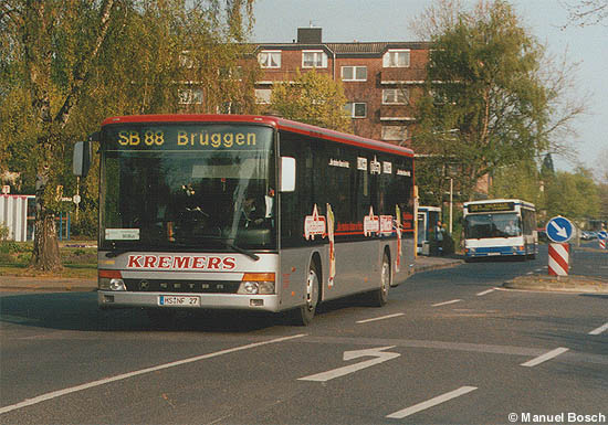 Aufnahme: Das im Auftrag der NVV verkehrende Busunternehmen Kremers aus Wassenberg setzte am 10.04.2002 den auf das Kennzeichen HS-NF 27 angemeldeten Setra S 315 NF ein, der am Bahnhof in Viersen aufgenommen wurde.
