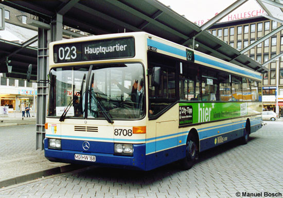 Nach zehn MAN SL 202 im Jahre 1986 stellte die SWMG im Jahr 1987 erneut zehn Mercedes-Benz O 405 in Dienst. Der Wagen 8708 wurde am 29.12.2001 am Mönchengladbacher Hauptbahnhof im Einsatz als Linie 023 angetroffen, während die ersten sieben Fahrzeuge dieser Lieferung bereits im Sommer 2001 ausgemustert worden waren.