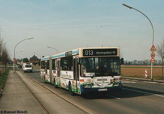 An einem sonnigen Märztag, dem 08.03.2002, befährt der Wagen 8861 im Einsatz auf der Stammlinie 013 - zur damaligen Zeit in einem gemeinsamen Fahrzeugumlauf mit der Linie 023 verbunden - die Roermonder Straße aus dem Stadtteil Hardt kommend stadteinwärts.
