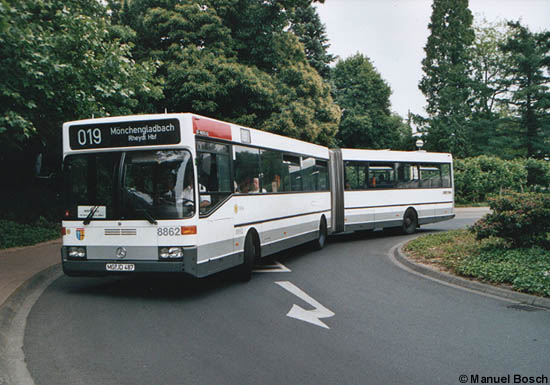 Als erster älterer Gelenkbus der NVV wurde der Wagen 8862 nach Entfernung der "Diebels Alt"-Vollwerbung in das neue Farbschema umlackiert. Am 13.06.2001 erreicht das Fahrzeug im Einsatz auf der Linie 019 den Busbahnhof in Viersen.