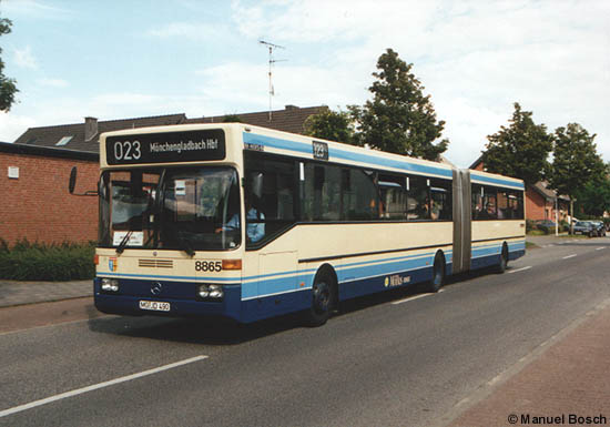 Anschließend war der Wagen 8865 bis September 1997 mit einer blauen Vollwerbung für die Bekleidungsmarke "Werdin" versehen. Nach der Neulackierung im traditionellen beige-blau verkehrte er bis zu seiner Ausmusterung werbefrei. Am 11.07.2002 kehrt das Fahrzeug im Einsatz auf der Linie 023 aus dem Hauptquartier zurück, als die Aufnahme auf der Fahrt in die Mönchengladbacher Innenstadt am Pastorenkamp im Stadtteil Hardt entstand.