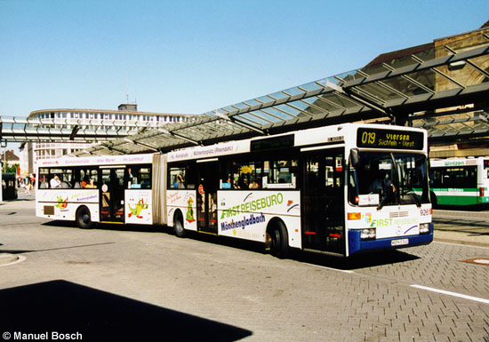 Die Vollwerbung eines Reisebüros trug lange Jahre mit dem Wagen 9261 der numerisch erste der sechs Mercedes-Benz O 405 G des Baujahres 1992. Am 25.05.2001 verlässt der Gelenkbus soeben den Mönchengladbacher Hauptbahnhof im Einsatz als Linie 019.
