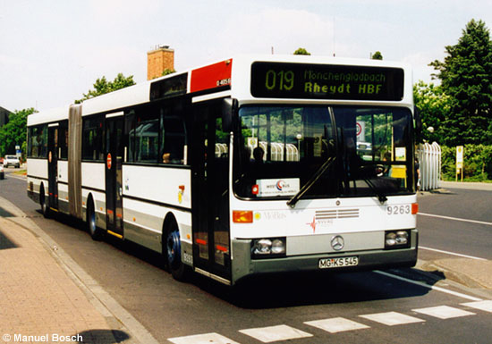 Als erster der Mercedes-Benz O 405 G des Baujahres 1992 erhielt der Wagen 9263 die neue Farbgebung der NVV; zugleich schied dieses Fahrzeug im Sommer 2005 als erstes und zunächst einziges Exemplar der Lieferserie aus dem Bestand. Am 01.06.2001 verlässt der Gelenkbus den Viersener Busbahnhof zur Fahrt in Richtung Mönchengladbach.