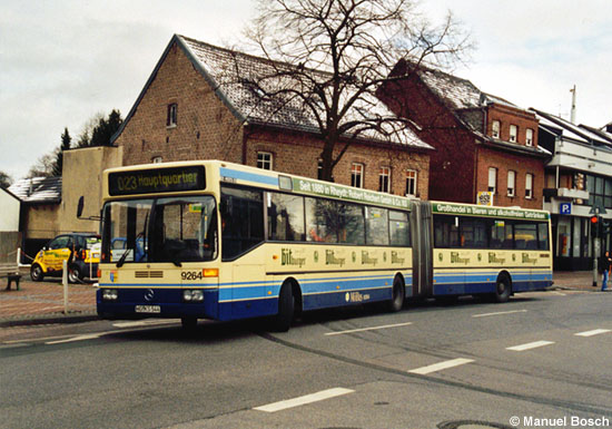 Wie die Mercedes-Benz O 405 G des Baujahres 1988 waren auch die 1992 gelieferten Gelenkbusse in den letzten Einsatzjahren überwiegend auf den Linien 013 und 023 anzutreffen. Auf dem Weg ins Hauptquartier verlässt der Wagen 9264 am frostigen 01.03.2006 als Linie 023 soeben die Haltestelle Hardt Markt.