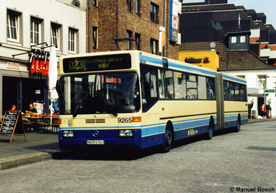 Die Wagen 9265 und 9266 erhielten im Jahre 1998 bei der Entfernung einer weißen Vollwerbung wieder die klassische beige-blaue Lackierung und waren fortan werbefrei im Einsatz. Am 08.05.2002 konnte der Wagen 9265 in diesem Zustand am Alten Markt in Mönchengladbach im Bild festgehalten werden.