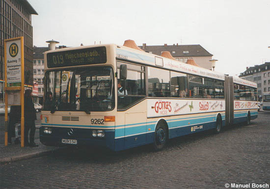 Exakt vier Jahre nach der Indienststellung entstand am 03.04.1996 diese Aufnahme des Wagen 9262 mit seiner damaligen Bandenwerbung am Mönchengladbacher Hauptbahnhof, dessen Bushaltestellen sich zu diesem Zeitpunkt noch im alten Zustand befanden.