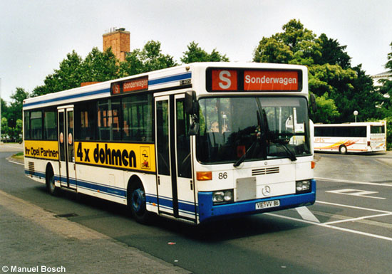 Nach dem in den Jahren 1987 und 1988 je ein Mercedes-Benz O 405 als erste Fahrzeuge dieses Herstellers von der VVG beschafft worden waren, folgten 1989 zwei weitere Omnibusse dieser Bauart. Der Wagen 86 wurde am 13.06.2001 am Viersener Busbahnhof aufgenommen.