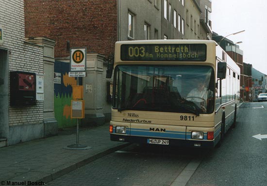 13.12.2001 | NVV, Mönchengladbach (TBA) Die NVV AG hat die Lieferung und Installation von elektronischen Fahrgastinformationssystemen für sieben Haltestellen in Mönchengladbach ausgeschrieben. Die Ausschreibung beinhaltet einen Großanzeiger, 20 Bussteiganzeiger, einen Monitor sowie optional elektroakustische Anlagen für die dynamische Fahrgastinformation. Bis zum 30.03.2002 soll der erste Anzeiger für die Haltestelle Wickrath Markt fertiggestellt sein. (n.de) Bereits seit einiger Zeit sind uns die Daten jener im Jahr 2000 an den Hersteller MAN zurückgegebenen Wagen des Typs A11 (NG 272) bekannt, die an die Berliner Verkehrs-Betriebe (BVG) weiterverkauft wurden. Von einer Veröffentlichung haben wir bislang abgesehen, stellen aber nun in der folgenden Übersicht alle früheren Mönchengladbacher Wagen mit ihren neuen Daten zusammen: