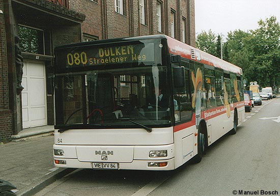 (n.de) Am Sonntag, dem 11.11.2001, fand in der Viersener Innenstadt der traditionelle Martinsmarkt statt. Wie bereits in den Vorjahren bestellte die Stadtsparkasse Viersen auch in diesem Jahr wieder einen Pendelbus zwischen dem Parkplatz am Einkaufszentrum an der Kanalstraße und dem Viersener Busbahnhof, der kostenlos zu benutzen war. Eingesetzt wurde der mit Werbung für die Stadtsparkasse versehene Wagen 84, ein MAN A21 (NL 223) des Baujahres 1999. Die Auslastung des im 30-Minuten-Takt verkehrenden Busses lag erfreulich hoch.