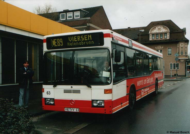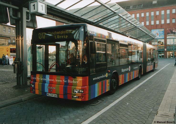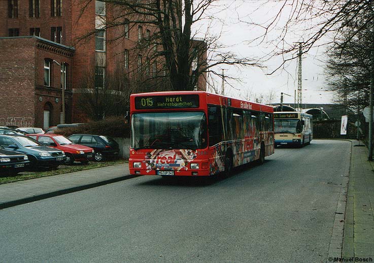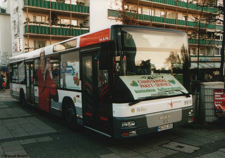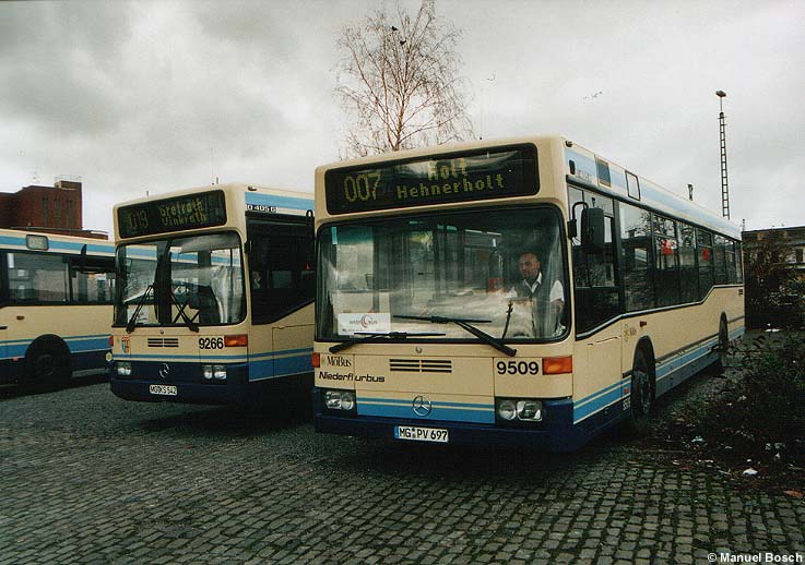 06.01.2002 | NVV, Mönchengladbach (n.de) Am 03.12.2001 berichteten wir in den News über den der gesteigerten Nachfrage angepassten Fahrplan an den Adventssamstagen. An dieser Stelle dokumentieren wir den Verkehr in der Adventszeit mit einigen Aufnahmen. Wie wir am 03.01.2002 meldeten, setzt das belgische Busunternehmen Theissen n.v. aus Bree drei ehemalige Mönchengladbacher Omnibusse ein. Die beiden folgenden Aufnahmen zeigen zwei dieser Wagen bei ihrem neuen Besitzer: 06.01.2002 | Brings, Willich (n.de) Bereits am 06.12.2001 berichteten wir, dass das Willicher Busunternehmen Brings Reisen im Auftrag der Busverkehr Rheinland GmbH den Schienenersatzverkehr zur Anbindung des vom 06.12.2001 bis zum 09.12.2001 von den Zügen der Deutschen Bahn AG nicht bedienten Bahnhofs Boisheim durchführte. 03.01.2002 | NVV, Mönchengladbach (n.de) Das Busunternehmen Teyssen n.v. aus dem belgischen Bree hat über die Lingner Handels-GmbH in Bochum drei Mercedes-Benz O 405 erworben, die zuvor beim Mönchengladbacher Verkehrsbetrieb MöBus im Einsatz waren. Sämtliche Busse werden im Auftrag des überregionalen belgischen Busunternehmens "De Lijn" eingesetzt und erhielten dafür neben der "De Lijn"-Lackierung auch entsprechende Wagennummern. Es handelt sich dabei um folgende Fahrzeuge: