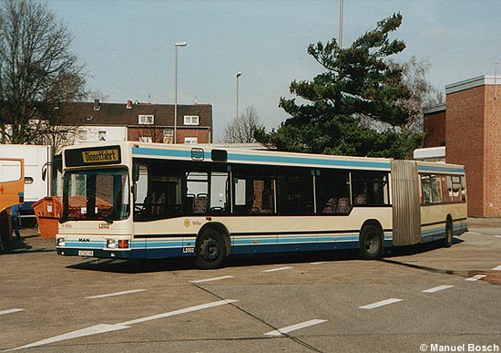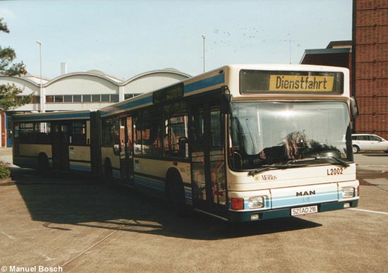 14.03.2002 | NVV, Mönchengladbach (n.de) Wie bereits am 08.03.2002 gemeldet, befindet sich der ehemalige Wagen 9461 nach seiner Rückgabe an den Hersteller im Mai 2002 nun als Leihwagen wieder im Bestand der NVV AG. Bislang konnte der als Wagen L2002 bezeichnete MAN A11 (NG 272) mit der Zulassung SZ-AD 216 allerdings noch nicht im Liniendienst gesichtet werden. Noch bis zum 07.03.2002 weilte er als Leihwagen mit der Nummer 9088 bei der Rheinbahn in Düsseldorf. (n.de / Christian Ewald) Durch die freundliche Unterstützung von Christian Ewald ist es uns möglich, an dieser Stelle weitere Aufnahmen von den ehemals in Mönchengladbach eingesetzten MAN A11 (NG 272) der Baujahre 1993 und 1994 bei ihrem neuen Besitzer in Berlin zu zeigen. Weitere Aufnahmen aus Berlin finden Sie in der Newsmeldung vom 25.02.2002. 08.03.2002 | NVV, Mönchengladbach (n.de) Der ehemalige MöBus-Wagen 9461 ist wieder in Mönchengladbach: seit dieser Woche ist der im Frühjahr 2000 an den Hersteller MAN zurückgegebene Niederflur-Gelenkbus des Typs A11 (NG 272) als Leihwagen mit der Zulassung SZ-AD 216 und der Wagennummer L2002 im Bestand der NVV AG. Über Hintergründe und Dauer des Leiheinsatzes liegen bislang keine Informationen vor, eine Aufnahme des Fahrzeugs folgt in der nächsten Woche an dieser Stelle.