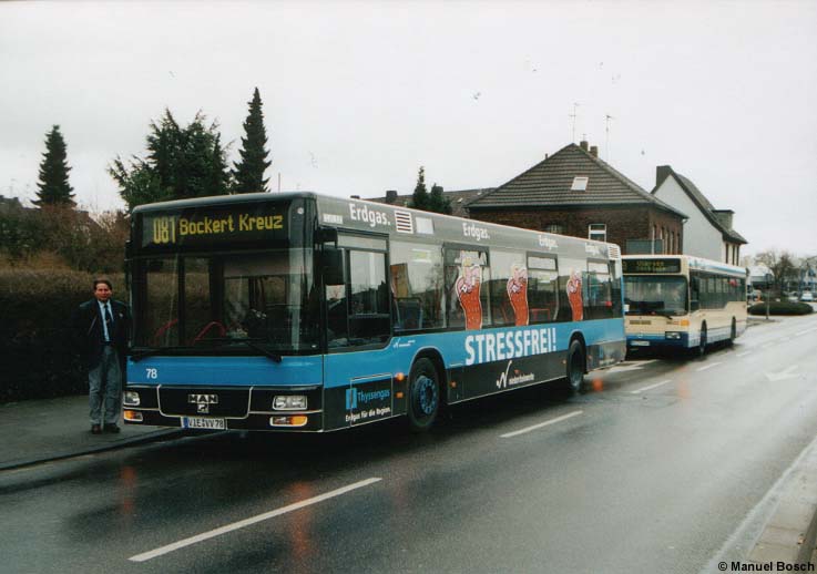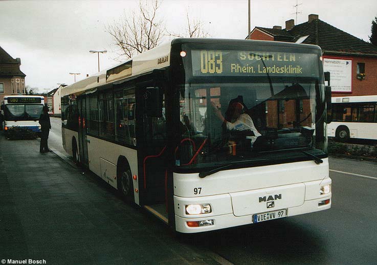 29.03.2002 | Kessels, Brüggen (IG RheinlandBus) Der private Omnibusbetrieb Kessels aus Brüggen im Kreis Viersen führt 15 Omnibusse in seinem Bestand. Darunter befinden sich drei Fahrzeuge, die zuvor beim Verkehrsbetrieb MöBus der Niederrheinischen Versorgung und Verkehr AG in Mönchengladbach eingesetzt waren: