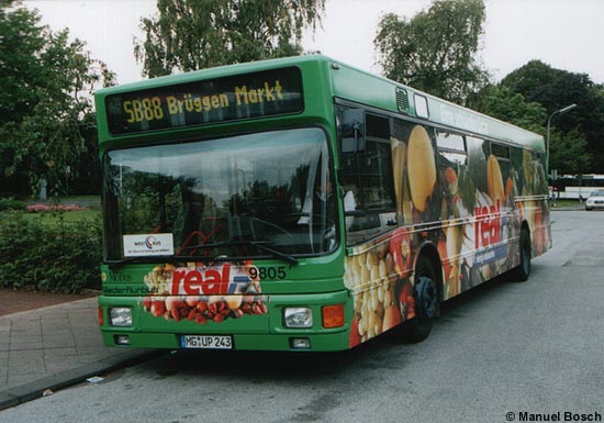 Die Aufnahme vom 15.09.2001 zeigt den NVV-Wagen 9805, einen MAN A10 (NL 222) mit "real"-Vollwerbung, im Einsatz auf der Linie SB88, aufgenommen am Bahnhof in Viersen. Dieses Bild gehört mit der jetzt erfolgten Umstellung der Vergangenheit an.