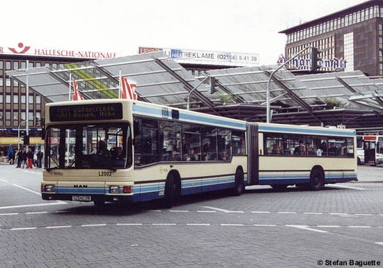 (B&B) Üblicherweise werden die Linien 001 und 002 vorrangig mit den jeweils jüngsten Gelenkbussen im Bestand bedient, zur Zeit sind dies die MAN A23 (NG 263) des Baujahres 2000. Am 30.04.2002 kam jedoch der Leihwagen L2002, ein MAN A11 (NG 272) aus dem Jahre 1994, auf der Linie 001 zum Einsatz.