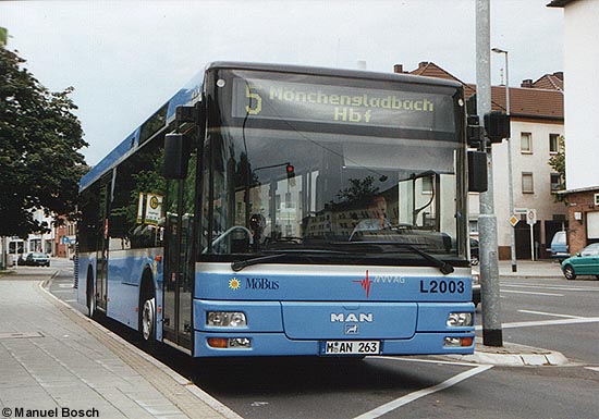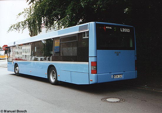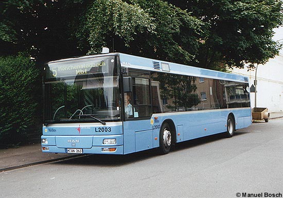 (B&B) Seit letzter Woche kommt bei der Niederrheinischen Versorgung und Verkehr AG (NVV AG) in Mönchengladbach ein Vorführwagen des MAN-Typs A21 (NL 263) zum Einsatz. Das im Jahre 1999 gebaute Fahrzeug erhielt die Lackierung der Münchener Verkehrsgesellschaft und wurde in München testweise im Liniendienst eingesetzt, wie ein in der Seitenscheibe klebender Nachtlinienplan des Münchener Verkehrsverbundes bestätigt. Der auf das Kennzeichen M-AN 263 zugelassene Niederflurbus wurde der NVV AG kurzzeitig von MAN als Ersatz für eigene MAN A21 (NL 223) zur Verfügung gestellt, die derzeit vom Hersteller im NVV-Betriebshof nachgebessert werden. Das in Mönchengladbach als Wagen L2003 bezeichnete Fahrzeug wird im regulären Solowagen-Umlauf eingesetzt, die Dauer des Leiheinsatzes ist bislang unbekannt.