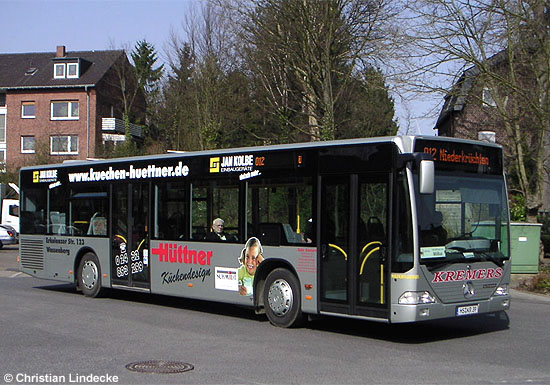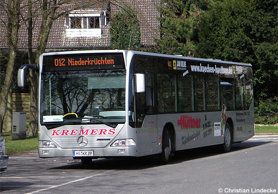 (n.de) Zwischenzeitlich wurde der im Dezember 2003 von der Firma Kremers in Wassenberg für den Auftragsverkehr der Niederrheinischen Versorgung und Verkehr AG (NVV) in Mönchengladbach beschaffte EvoBus MB O 530 (Citaro) mit dem Kennzeichen HS-KR 39 mit Unternehmensanschriften und einer Reklamebeklebung versehen. Christian Lindecke nahm den neuen Wagen am 17.03.2004 in Brüggen (links) sowie in Niederkrüchten im Einsatz auf der Linie 012 auf. Für den Auftragsverkehr der WestEnergie und Verkehr GmbH (west) mit Sitz in Erkelenz stellte Kremers zeitgleich ein baugleiches Fahrzeug unter der Zulassung HS-KR 83 in Dienst.