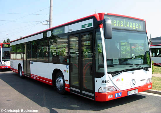 (n.de / Christoph Beckmann) Der als Wagen 5447 angelieferte EvoBus MB O 530 (Citaro) der Stadtwerke Krefeld MOBIL GmbH (SWK) wurde noch vor dem ersten Einsatz in Wagen 5450 umgezeichnet, nachdem er wie gemeldet abweichend das entsprechende Kennzeichen KR-ZE 50 erhalten hatte. Die Aufnahme von Christoph Beckmann zeigt dieses Fahrzeug stellvertretend für die aktuelle Neubeschaffung der SWK am 18.07.2005 auf dem Betriebshof.