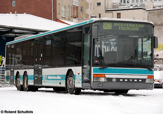Zudem waren bei der BVR abermals zwei Ausmusterungen zu verzeichnen. Mit der Abstellung des Setra S 315 NF mit dem Kennzei- chen D-BV 6004 ist die erste, im Jahre 1996 beschaffte Serie dieses Typs, die noch mit Schaltgetrieben ausgerüstet war, vollständig aus dem Bestand ausgeschieden. Die Ausmusterung des auf D-BV 8105 zugelassenen Setra S 319 NF beendete hingegen die Ära der "StädteSchnellBus"-Lackierung bei der BVR; dieser Wagen ist im rechten Bild ebenfalls auf dem Düsseldorfer Betriebshof zu sehen.