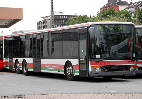 Seit Anfang Juni setzt die BVR erneut einen Leihwagen von MAN ein. Der in Ver- kehrsrot lackierte MAN A20 (Lion's City) mit der Zulassung DGF-DB 33 kam bereits bei mehreren Busgesellschaften der Deutschen Bahn AG zum Einsatz. Die rechte Aufnahme von Roland Schulteis zeigt das Fahrzeug ebenfalls am 10.06.2011 am Viersener Busbahnhof im Einsatz als Linie 094.