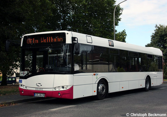 (n.de) Die NEW mobil und aktiv Viersen GmbH hat Mitte August zwei Neufahr- zeuge im Betrieb genommen. Die beiden Solaris Urbino 12 erhielten die Wagen- nummern 18 und 30 mit den entsprechenden Kennzeichen VIE-NW 18 und 30. Außenlackierung und Innenausstattung sind in gleicher Weise gestaltet wie bei den diesjährigen Neuwagen der NEW mobil und aktiv Mönchengladbach GmbH, so dass erstmals zwei Unternehmen der Ausschreibungsgemeinschaft Mittlerer Niederrhein tatsächlich identisch ausgestattete Fahrzeuge beschafft haben. Die Aufnahmen von Christoph Beckmann zeigen den Wagen 30 am 30.08.2012 an der Haltestelle Bockert Kreuz.