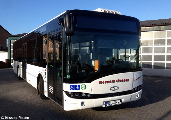 (n.de / Fa. Kessels) Die Firma Kessels-Reisen aus Brüggen hat im April einen neu beschafften Solaris Urbino 12 in Betrieb genommen. Das Fahrzeug wurde auf das Kennzeichen VIE-JK 22 zugelassen und kommt zunächst im Auftragsverkehr für die BVR Busverkehr Rheinland GmbH zum Einsatz. Damit hat erstmals ein privates Busunternehmen aus dem Kreis Viersen einen Bus des polnischen Herstellers in Dienst gestellt. Die beiden Aufnahmen der Firma Kessels zeigen den Neuzugang auf dem Betriebshof.