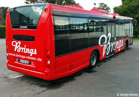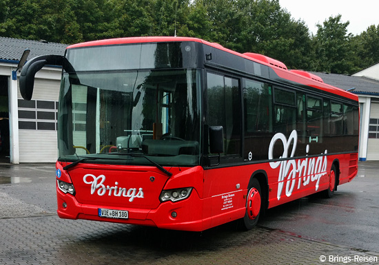 (n.de / Fa. Brings) Die Brings Reisen GmbH & Co. KG aus Willich hat im Sep- tember zwei Scania Citywide LE in Dienst gestellt. Die Fahrzeuge wurden auf die Kennzeichen VIE-BH 180 und VIE-BH 920 zugelassen und werden in dieser Reihenfolge im Auftragsverkehr für die BVR Busverkehr Rheinland GmbH und die Düsseldorfer Rheinbahn AG eingesetzt. Die Low-Entry-Busse sind die ersten Linienbusse von Scania im Kreis Viersen. Die Aufnahmen der Firma Brings zeigen den Wagen VIE-BH 180 auf dem Betriebshof.