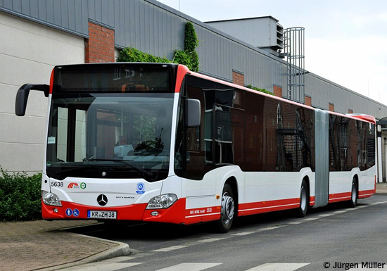 (n.de) Die diesjährige Fahrzeugbeschaffung der Stadtwerke Krefeld MOBIL GmbH (SWK) umfasst vier EvoBus MB O 530 G C2 (Citaro), die als Wagen 5638 bis 5641 eingereiht und auf die entsprechenden Kennzeichen KR-ZH 38 bis 41 zugelassen wurden. Die Gelenkbusse entsprechend weitgehend der Lieferung typgleicher Fahrzeuge des Jahres 2013. Die beiden Aufnahmen zeigen den Wagen 5638 auf dem Betriebshof der SWK.