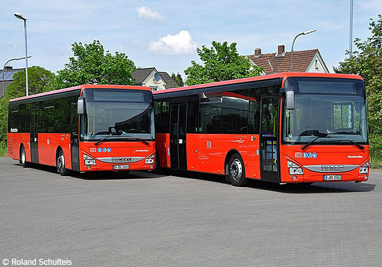 (n.de / Roland Schulteis) Die BVR Busverkehr Rheinland GmbH mit Sitz in Düsseldorf hat Anfang Mai zwei weitere Iveco Crossway LE in Dienst gestellt. Die Neuwagen erhielten die Kennzeichen D-BV 3502 und 3503. Die Fahrzeuge werden ab dem 01.06.2016 von Gummersbach aus im Auftragsverkehr der Oberbergi- schen Verkehrsgesellschaft mbH (OVAG) zum Einsatz kommen. Als Reservebus dient in Gummersbach zudem der Setra S 415 NF mit der Zulassung D-BV 714. Die Aufnahme von Roland Schulteis zeigt die beiden neuen Iveco Crossway LE am 10.05.2016 in Herford vor der Überführung zum künftigen Einsatzort.