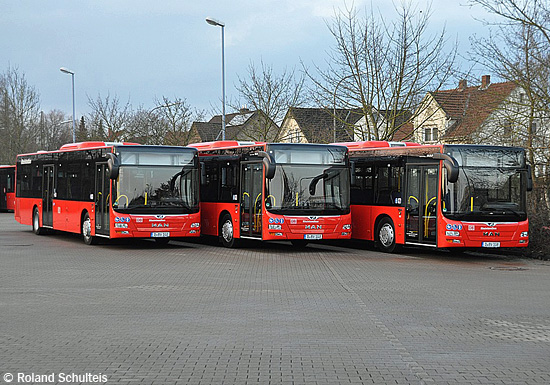 (n.de / Roland Schulteis) Die BVR Busverkehr Rheinland GmbH mit Sitz in Düsseldorf hat Mitte März vier neue MAN A21 (NL 283 Lion's City) erhalten. Die Fahrzeuge erhielten die Kennzeichen D-BV 102, 103, 106 und 108. Die Aufnahme von Roland Schulteis zeigt drei der vier Neuwagen in Herford, wo die Aufrüstung durchgeführt wurde. Zur Ausmusterung vorgesehen sind die Anfang 2007 in Dienst gestellten MAN A20 (NÜ 273 Lion's City) mit den Zulassungen D-BV 710 und 712, die bereits abgerüstet, bislang aber noch nicht abgemeldet wurden.