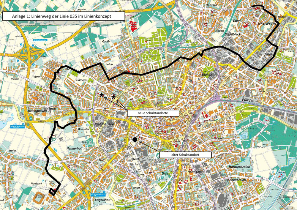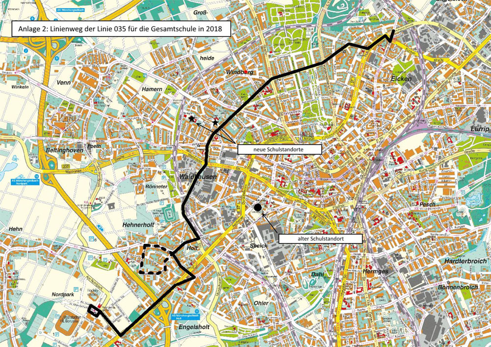 (n.de) Der Planungs- und Bauauschuss der Stadt Mönchengladbach wird sich in seiner Sitzung am 24.04.2018 auch mit Fahrplanänderungen zum diesjährigen Fahrplanwechsel der NEW mobil und aktiv Mönchengladbach GmbH befassen. Im besonderen Fokus steht die vorzeitige Einführung der nordwestlichen Tangentiallinie 035, um die neuen Schulstandorte der Gesamtschule Stadtmitte an das Busliniennetz anbinden zu können. In diesem Zusammenhang wird auch der Linienverlauf gegenüber dem ursprünglichen Linienkonzept geändert: Unverändert vom Nordpark ausgehend, soll die Linie nicht wie geplant über Rönneter, Venn, Hamern und Windberg geführt werden, sondern über Holt und Waldhausen zur Kreuzung Viersener Straße/Waldhausener Straße/Schürenweg gelangen.