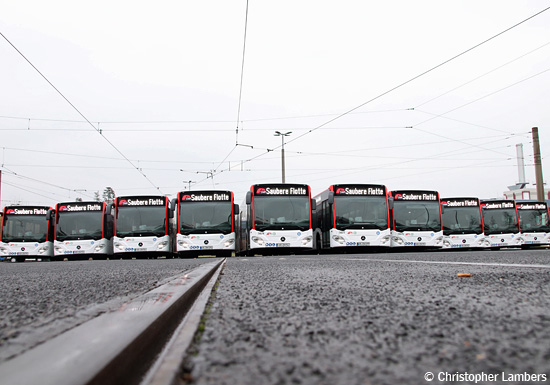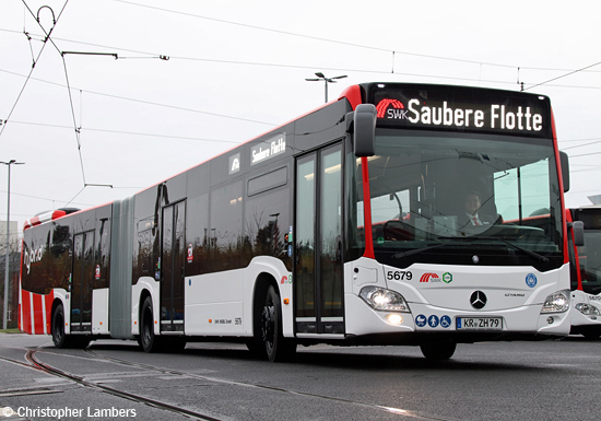 (n.de) Die Stadtwerke Krefeld MOBIL GmbH (SWK) hat zehn neue EvoBus MB O 530 G C2 Hybrid (Citaro) in Dienst gestellt. Die Gelenkbusse wurden unter den Wagennummern 5670 bis 5679 eingereiht und in dieser Reihenfolge auf die Kennzeichen KR-ZH 170, 71 bis 76, 177, 78 und 79 zugelassen. Christopher Lambers konnte den Wagen 5679 sowie alle zehn Neufahrzeuge bei der Pressevorstellung am 26.11.2018 auf dem Betriebshof der SWK aufnehmen.