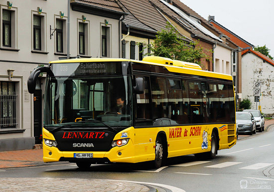 (n.de) Seit dem 01.07.2021 ist die Lennartz Reisen GmbH als Subunternehmer für die Kraftverkehr Schwalmtal von der Forst GmbH & Co. KG (KVS) wieder im Linienverkehr tätig. Das Unternehmen bedient den Stammumlauf der Linie 038 sowie einige der Verstärkerfahrten dieser Linie, zudem auch Fahrten der Linien 065 und 066. Dafür stehen mindestens ein Setra S 415 LE mit dem Kennzeichen MG-HM 580, zwei Scania Citywide LE mit den Kennzeichen MG-HM 980 und 981, ein auf MG-HM 985 angemeldeter EvoBus MB O 530 LE (Citaro) sowie ein gebraucht beschaffter viertüriger EvoBus MB O 530 G (Citaro) mit der Zulassung MG-HM 988 zur Verfügung. Die Aufnahmen von Christopher Lambers vom ersten Betriebstag zeigen den auf MG-HM 981 angemeldeten Scania Citywide LE in Willich-Anrath an der Kirche sowie den Gelenkbus an der Ulmenstraße.