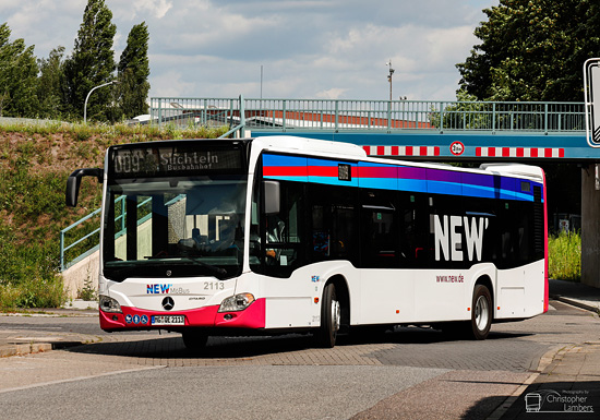 (n.de) Die NEW mobil und aktiv Mönchengladbach GmbH hat Ende Juli 15 Neuwagen in Dienst gestellt. Die 14 EvoBus MB O 530 C2 Hybrid (Citaro) wurden als Wagen 2101 bis 2114 eingereiht, ein einzelner EvoBus MB O 530 G C2 Hybrid (Citaro) als Wagen 2161 - alle Fahrzeuge erhielten Zulassungen auf MG-QE + Wagennummer. Die technische und optische Ausstattung entspricht den im vergangenen Jahr beschafften Bussen. Den Wagen 2113 konnte Christopher Lambers am 29.07.2021 an der Haltestelle Ziegelgrund ablichten.