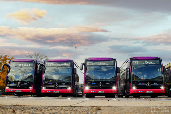 (n.de) Die NEW mobil und aktiv Mönchengladbach GmbH hat nun alle vier Elektrobusse in Betrieb genommen. Die EvoBus MB eCitaro erhielten die Wagennummern 2121 bis 2124 sowie in der Reihenfolge der Wagennummern die Kennzeichen MG-E 2121, 2122, 2120 und 2124 mit nachgestelltem E für Elektrofahrzeug. Die offizielle Inbetriebnahme erfolgte am 10.11.2021, seither kommen die Fahrzeuge auf der Linie 033 zum Einsatz.