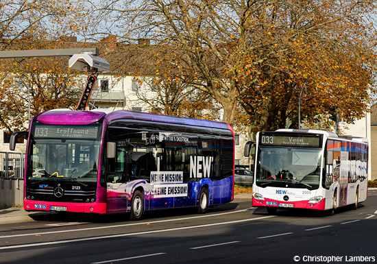 Ladesäulen sind für das Nachladen tagsüber an der Endstelle Künkelstraße sowie für die Übernachtladung auf dem Betriebshof vorhanden, die Busse sind dafür mit einem Dachstromabnehmer ausgestattet. Neben der auffälligen Beklebung weicht auch die Innenraumgestaltung mit blauen Sitzpolstern, Griffstangen in Edelstahloptik, Ambientebeleuchtung und USB-Ladebuchsen von jener der zuletzt beschafften Dieselbusse ab. Die Aufnahmen von Christophes Lambers zeigen alle vier Elektrobusse auf dem Betriebshof sowie Wagen 2123 am 10.11.2021 bei der Eröffnungsveranstaltung an der Künkelstraße.