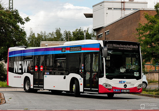 (n.de) Die NEW mobil und aktiv Viersen GmbH hat Ende Juli ihre beiden diesjährigen Neufahrzeuge in Betrieb genommen. Die beiden EvoBus MB O 530 C2 Hybrid (Citaro) erhielten die Wagennummern 14 und 15 mit den entsprechenden Zulassungen VIE-NW 14 und 15. Die Ausstattung mit Hybridmodul, Klimaanlage und Abbiegeassistent entspricht den Fahrzeugen der Vorjahresbeschaffung. Die Aufnahme von Christopher Lambers zeigt Wagen 15 am 28.07.2021 am Viersener Bahnhof, die Zielanzeige zeigt statt der aktuellen Liniennummer 089 noch die bis Ende 2019 gültige Bezeichnung CE89 an.